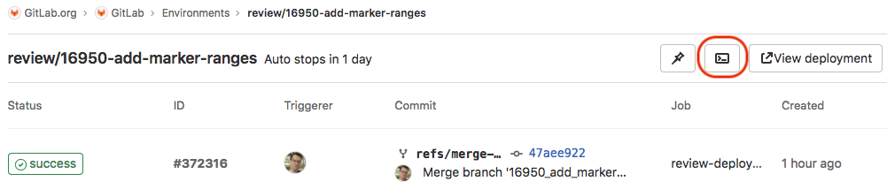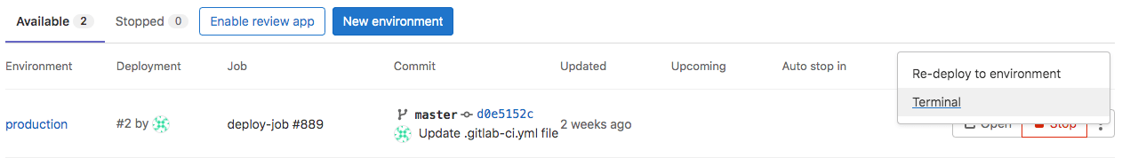 stages: - build - test - deploy ... deploy_review: stage: deploy environment: name: review/$CI_COMMIT_REF_SLUG url: https://$CI_ENVIRONMENT_SLUG.example.com on_stop: stop_review stop_review: stage: deploy environment: name: review/$CI_COMMIT_REF_SLUG action: stop when: manual